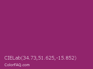 CIELab 34.73,51.625,-15.852 Color is a normal magenta color and the nearest color is Amaranth Deep Purple #9f2b68. Hex code #91246c and RGB value is rgb(145,36,108). In RGB color space, this color is composed of 57% red, 14% green, 42% blue, In CMYK color space, this color is composed of 0% cyan, 75% magenta, 26% yellow , 43% black , In HSL color space, this color has a hue angle of 320° , 60% saturation and 35% lightness.