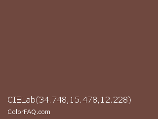 CIELab 34.748,15.478,12.228 Color is a normal red color and the nearest color is Roast Coffee #704241. Hex code #6f483f and RGB value is rgb(111,72,63). In RGB color space, this color is composed of 44% red, 28% green, 25% blue, In CMYK color space, this color is composed of 0% cyan, 35% magenta, 43% yellow , 56% black , In HSL color space, this color has a hue angle of 11° , 28% saturation and 34% lightness.