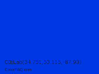 CIELab 34.751,53.115,-87.93 Color is a normal blue color and the nearest color is Blue RYB #0247fe. Hex code #0038e3 and RGB value is rgb(0,56,227). In RGB color space, this color is composed of 0% red, 22% green, 89% blue, In CMYK color space, this color is composed of 100% cyan, 75% magenta, 0% yellow , 11% black , In HSL color space, this color has a hue angle of 225° , 100% saturation and 45% lightness.