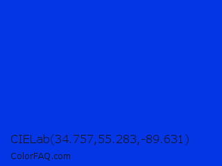 CIELab 34.757,55.283,-89.631 Color is a normal blue color and the nearest color is Blue RYB #0247fe. Hex code #0436e6 and RGB value is rgb(4,54,230). In RGB color space, this color is composed of 2% red, 21% green, 90% blue, In CMYK color space, this color is composed of 98% cyan, 77% magenta, 0% yellow , 10% black , In HSL color space, this color has a hue angle of 227° , 97% saturation and 46% lightness.
