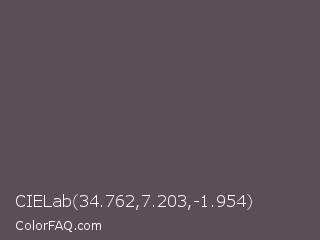 CIELab 34.762,7.203,-1.954 Color is a normal rose color and the nearest color is Don Juan #5d4c51. Hex code #5c4e55 and RGB value is rgb(92,78,85). In RGB color space, this color is composed of 36% red, 31% green, 33% blue, In CMYK color space, this color is composed of 0% cyan, 15% magenta, 8% yellow , 64% black , In HSL color space, this color has a hue angle of 330° , 8% saturation and 33% lightness.