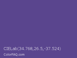 CIELab 34.768,26.5,-37.524 Color is a normal indigo color and the nearest color is Victoria #534491. Hex code #5a458e and RGB value is rgb(90,69,142). In RGB color space, this color is composed of 35% red, 27% green, 56% blue, In CMYK color space, this color is composed of 37% cyan, 51% magenta, 0% yellow , 44% black , In HSL color space, this color has a hue angle of 257° , 35% saturation and 41% lightness.