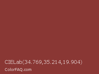 CIELab 34.769,35.214,19.904 Color is a normal red color and the nearest color is Sanguine Brown #8d3d38. Hex code #8a3734 and RGB value is rgb(138,55,52). In RGB color space, this color is composed of 54% red, 22% green, 20% blue, In CMYK color space, this color is composed of 0% cyan, 60% magenta, 62% yellow , 46% black , In HSL color space, this color has a hue angle of 2° , 45% saturation and 37% lightness.