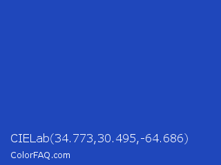 CIELab 34.773,30.495,-64.686 Color is a normal blue color and the nearest color is Denim Blue #2243b6. Hex code #1f47bb and RGB value is rgb(31,71,187). In RGB color space, this color is composed of 12% red, 28% green, 73% blue, In CMYK color space, this color is composed of 83% cyan, 62% magenta, 0% yellow , 27% black , In HSL color space, this color has a hue angle of 225° , 72% saturation and 43% lightness.