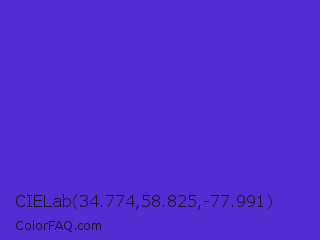 CIELab 34.774,58.825,-77.991 Color is a normal indigo color and the nearest color is Purple Heart Crayola #652dc1. Hex code #552cd2 and RGB value is rgb(85,44,210). In RGB color space, this color is composed of 33% red, 17% green, 82% blue, In CMYK color space, this color is composed of 60% cyan, 79% magenta, 0% yellow , 18% black , In HSL color space, this color has a hue angle of 255° , 65% saturation and 50% lightness.