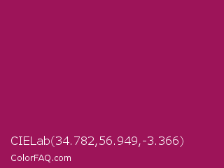CIELab 34.782,56.949,-3.366 Color is a normal rose color and the nearest color is Jazzberry Jam #a50b5e. Hex code #9d1459 and RGB value is rgb(157,20,89). In RGB color space, this color is composed of 62% red, 8% green, 35% blue, In CMYK color space, this color is composed of 0% cyan, 87% magenta, 43% yellow , 38% black , In HSL color space, this color has a hue angle of 330° , 77% saturation and 35% lightness.