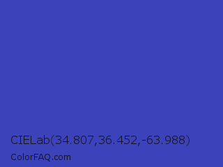 CIELab 34.807,36.452,-63.988 Color is a normal blue color and the nearest color is Violet Blue #324ab2. Hex code #3c42ba and RGB value is rgb(60,66,186). In RGB color space, this color is composed of 24% red, 26% green, 73% blue, In CMYK color space, this color is composed of 68% cyan, 65% magenta, 0% yellow , 27% black , In HSL color space, this color has a hue angle of 237° , 51% saturation and 48% lightness.