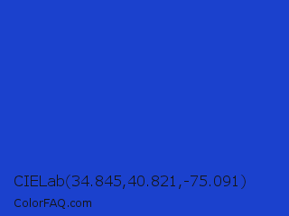CIELab 34.845,40.821,-75.091 Color is a normal blue color and the nearest color is New Car #214fc6. Hex code #1b41cd and RGB value is rgb(27,65,205). In RGB color space, this color is composed of 11% red, 25% green, 80% blue, In CMYK color space, this color is composed of 87% cyan, 68% magenta, 0% yellow , 20% black , In HSL color space, this color has a hue angle of 227° , 77% saturation and 45% lightness.