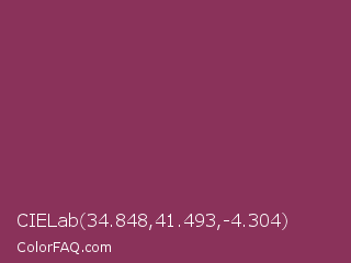 CIELab 34.848,41.493,-4.304 Color is a normal rose color and the nearest color is Camelot #893456. Hex code #8a325a and RGB value is rgb(138,50,90). In RGB color space, this color is composed of 54% red, 20% green, 35% blue, In CMYK color space, this color is composed of 0% cyan, 64% magenta, 35% yellow , 46% black , In HSL color space, this color has a hue angle of 333° , 47% saturation and 37% lightness.
