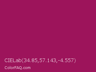 CIELab 34.85,57.143,-4.557 Color is a normal rose color and the nearest color is Jazzberry Jam #a50b5e. Hex code #9d145b and RGB value is rgb(157,20,91). In RGB color space, this color is composed of 62% red, 8% green, 36% blue, In CMYK color space, this color is composed of 0% cyan, 87% magenta, 42% yellow , 38% black , In HSL color space, this color has a hue angle of 329° , 77% saturation and 35% lightness.