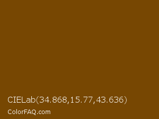 CIELab 34.868,15.77,43.636 Color is a dark orange color and the nearest color is Antique Bronze #704a07. Hex code #774702 and RGB value is rgb(119,71,2). In RGB color space, this color is composed of 47% red, 28% green, 1% blue, In CMYK color space, this color is composed of 0% cyan, 40% magenta, 98% yellow , 53% black , In HSL color space, this color has a hue angle of 35° , 97% saturation and 24% lightness.