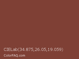 CIELab 34.875,26.05,19.059 Color is a normal red color and the nearest color is Medium Tuscan Red #79443b. Hex code #7f4035 and RGB value is rgb(127,64,53). In RGB color space, this color is composed of 50% red, 25% green, 21% blue, In CMYK color space, this color is composed of 0% cyan, 50% magenta, 58% yellow , 50% black , In HSL color space, this color has a hue angle of 9° , 41% saturation and 35% lightness.