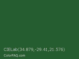 CIELab 34.879,-29.41,21.576 Color is a dark green color and the nearest color is Mughal Green #306030. Hex code #265d2e and RGB value is rgb(38,93,46). In RGB color space, this color is composed of 15% red, 36% green, 18% blue, In CMYK color space, this color is composed of 59% cyan, 0% magenta, 51% yellow , 64% black , In HSL color space, this color has a hue angle of 129° , 42% saturation and 26% lightness.