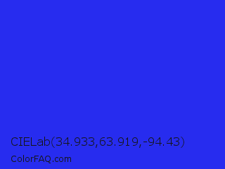 CIELab 34.933,63.919,-94.43 Color is a normal blue color and the nearest color is Bluebonnet #1c1cf0. Hex code #272cef and RGB value is rgb(39,44,239). In RGB color space, this color is composed of 15% red, 17% green, 94% blue, In CMYK color space, this color is composed of 84% cyan, 82% magenta, 0% yellow , 6% black , In HSL color space, this color has a hue angle of 239° , 86% saturation and 55% lightness.