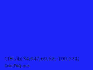 CIELab 34.947,69.62,-100.624 Color is a normal blue color and the nearest color is Bluebonnet #1c1cf0. Hex code #1c25fa and RGB value is rgb(28,37,250). In RGB color space, this color is composed of 11% red, 15% green, 98% blue, In CMYK color space, this color is composed of 89% cyan, 85% magenta, 0% yellow , 2% black , In HSL color space, this color has a hue angle of 238° , 96% saturation and 55% lightness.