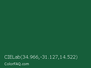 CIELab 34.966,-31.127,14.522 Color is a dark green color and the nearest color is Green Pea #1d6142. Hex code #165e3a and RGB value is rgb(22,94,58). In RGB color space, this color is composed of 9% red, 37% green, 23% blue, In CMYK color space, this color is composed of 77% cyan, 0% magenta, 38% yellow , 63% black , In HSL color space, this color has a hue angle of 150° , 62% saturation and 23% lightness.