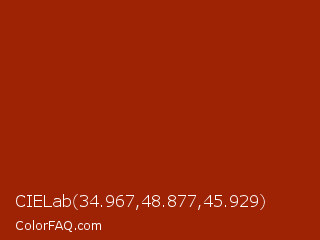 CIELab 34.967,48.877,45.929 Color is a normal red color and the nearest color is Totem Pole #991b07. Hex code #9e2305 and RGB value is rgb(158,35,5). In RGB color space, this color is composed of 62% red, 14% green, 2% blue, In CMYK color space, this color is composed of 0% cyan, 78% magenta, 97% yellow , 38% black , In HSL color space, this color has a hue angle of 12° , 94% saturation and 32% lightness.