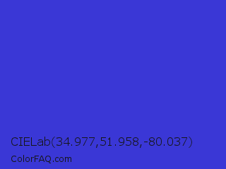 CIELab 34.977,51.958,-80.037 Color is a normal indigo color and the nearest color is Palatinate Blue #273be2. Hex code #3a37d6 and RGB value is rgb(58,55,214). In RGB color space, this color is composed of 23% red, 22% green, 84% blue, In CMYK color space, this color is composed of 73% cyan, 74% magenta, 0% yellow , 16% black , In HSL color space, this color has a hue angle of 241° , 66% saturation and 53% lightness.