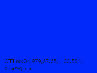 CIELab 34.979,67.65,-100.584 Color is a normal blue color and the nearest color is Blue RYB #0247fe. Hex code #0029fa and RGB value is rgb(0,41,250). In RGB color space, this color is composed of 0% red, 16% green, 98% blue, In CMYK color space, this color is composed of 100% cyan, 84% magenta, 0% yellow , 2% black , In HSL color space, this color has a hue angle of 230° , 100% saturation and 49% lightness.