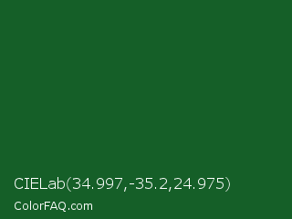 CIELab 34.997,-35.2,24.975 Color is a dark green color and the nearest color is Cal Poly Pomona Green #1e4d2b. Hex code #155f28 and RGB value is rgb(21,95,40). In RGB color space, this color is composed of 8% red, 37% green, 16% blue, In CMYK color space, this color is composed of 78% cyan, 0% magenta, 58% yellow , 63% black , In HSL color space, this color has a hue angle of 135° , 64% saturation and 23% lightness.