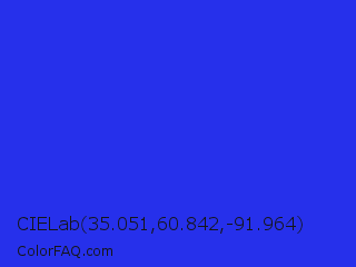 CIELab 35.051,60.842,-91.964 Color is a normal blue color and the nearest color is Palatinate Blue #273be2. Hex code #2630eb and RGB value is rgb(38,48,235). In RGB color space, this color is composed of 15% red, 19% green, 92% blue, In CMYK color space, this color is composed of 84% cyan, 80% magenta, 0% yellow , 8% black , In HSL color space, this color has a hue angle of 237° , 83% saturation and 54% lightness.