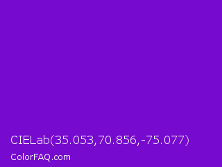 CIELab 35.053,70.856,-75.077 Color is a normal purple color and the nearest color is French Violet #8806ce. Hex code #760ace and RGB value is rgb(118,10,206). In RGB color space, this color is composed of 46% red, 4% green, 81% blue, In CMYK color space, this color is composed of 43% cyan, 95% magenta, 0% yellow , 19% black , In HSL color space, this color has a hue angle of 273° , 91% saturation and 42% lightness.