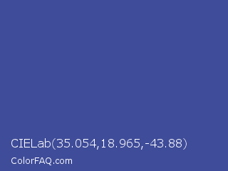 CIELab 35.054,18.965,-43.88 Color is a normal blue color and the nearest color is Chambray #354e8c. Hex code #3f4c99 and RGB value is rgb(63,76,153). In RGB color space, this color is composed of 25% red, 30% green, 60% blue, In CMYK color space, this color is composed of 59% cyan, 50% magenta, 0% yellow , 40% black , In HSL color space, this color has a hue angle of 231° , 42% saturation and 42% lightness.