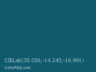 CIELab 35.056,-14.245,-16.991 Color is a dark cyan color and the nearest color is Chathams Blue #175579. Hex code #105a6d and RGB value is rgb(16,90,109). In RGB color space, this color is composed of 6% red, 35% green, 43% blue, In CMYK color space, this color is composed of 85% cyan, 17% magenta, 0% yellow , 57% black , In HSL color space, this color has a hue angle of 192° , 74% saturation and 25% lightness.