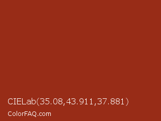 CIELab 35.08,43.911,37.881 Color is a normal red color and the nearest color is Tabasco #a02712. Hex code #982c17 and RGB value is rgb(152,44,23). In RGB color space, this color is composed of 60% red, 17% green, 9% blue, In CMYK color space, this color is composed of 0% cyan, 71% magenta, 85% yellow , 40% black , In HSL color space, this color has a hue angle of 10° , 74% saturation and 34% lightness.