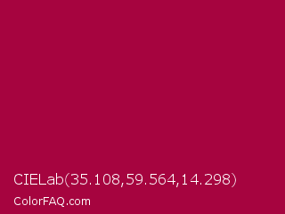 CIELab 35.108,59.564,14.298 Color is a normal rose color and the nearest color is Pink Raspberry #980036. Hex code #a6043f and RGB value is rgb(166,4,63). In RGB color space, this color is composed of 65% red, 2% green, 25% blue, In CMYK color space, this color is composed of 0% cyan, 98% magenta, 62% yellow , 35% black , In HSL color space, this color has a hue angle of 338° , 95% saturation and 33% lightness.