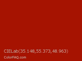 CIELab 35.148,55.373,48.963 Color is a normal red color and the nearest color is Mordant Red 19 #ae0c00. Hex code #a61300 and RGB value is rgb(166,19,0). In RGB color space, this color is composed of 65% red, 7% green, 0% blue, In CMYK color space, this color is composed of 0% cyan, 89% magenta, 100% yellow , 35% black , In HSL color space, this color has a hue angle of 7° , 100% saturation and 33% lightness.
