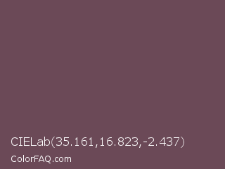 CIELab 35.161,16.823,-2.437 Color is a normal rose color and the nearest color is Ferra #704f50. Hex code #6b4957 and RGB value is rgb(107,73,87). In RGB color space, this color is composed of 42% red, 29% green, 34% blue, In CMYK color space, this color is composed of 0% cyan, 32% magenta, 19% yellow , 58% black , In HSL color space, this color has a hue angle of 335° , 19% saturation and 35% lightness.