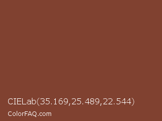CIELab 35.169,25.489,22.544 Color is a normal red color and the nearest color is Nutmeg #81422c. Hex code #804130 and RGB value is rgb(128,65,48). In RGB color space, this color is composed of 50% red, 25% green, 19% blue, In CMYK color space, this color is composed of 0% cyan, 49% magenta, 63% yellow , 50% black , In HSL color space, this color has a hue angle of 13° , 45% saturation and 35% lightness.