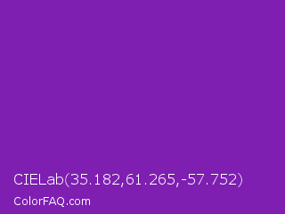 CIELab 35.182,61.265,-57.752 Color is a normal purple color and the nearest color is Grape #6f2da8. Hex code #7e1fb1 and RGB value is rgb(126,31,177). In RGB color space, this color is composed of 49% red, 12% green, 69% blue, In CMYK color space, this color is composed of 29% cyan, 82% magenta, 0% yellow , 31% black , In HSL color space, this color has a hue angle of 279° , 70% saturation and 41% lightness.