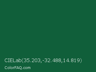CIELab 35.203,-32.488,14.819 Color is a very dark green color and the nearest color is Jewel #126b40. Hex code #105f3a and RGB value is rgb(16,95,58). In RGB color space, this color is composed of 6% red, 37% green, 23% blue, In CMYK color space, this color is composed of 83% cyan, 0% magenta, 39% yellow , 63% black , In HSL color space, this color has a hue angle of 152° , 71% saturation and 22% lightness.