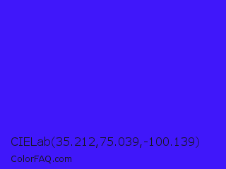 CIELab 35.212,75.039,-100.139 Color is a normal indigo color and the nearest color is Han Purple #5218fa. Hex code #4017fa and RGB value is rgb(64,23,250). In RGB color space, this color is composed of 25% red, 9% green, 98% blue, In CMYK color space, this color is composed of 74% cyan, 91% magenta, 0% yellow , 2% black , In HSL color space, this color has a hue angle of 251° , 96% saturation and 54% lightness.