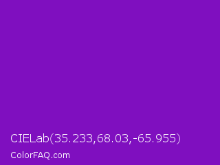 CIELab 35.233,68.03,-65.955 Color is a normal purple color and the nearest color is French Violet #8806ce. Hex code #7f0fbf and RGB value is rgb(127,15,191). In RGB color space, this color is composed of 50% red, 6% green, 75% blue, In CMYK color space, this color is composed of 34% cyan, 92% magenta, 0% yellow , 25% black , In HSL color space, this color has a hue angle of 278° , 85% saturation and 40% lightness.