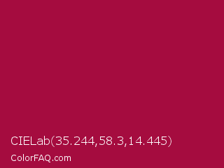 CIELab 35.244,58.3,14.445 Color is a normal rose color and the nearest color is Shiraz #b20931. Hex code #a50c3f and RGB value is rgb(165,12,63). In RGB color space, this color is composed of 65% red, 5% green, 25% blue, In CMYK color space, this color is composed of 0% cyan, 93% magenta, 62% yellow , 35% black , In HSL color space, this color has a hue angle of 340° , 86% saturation and 35% lightness.