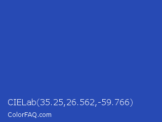 CIELab 35.25,26.562,-59.766 Color is a normal blue color and the nearest color is Denim Blue #2243b6. Hex code #274ab4 and RGB value is rgb(39,74,180). In RGB color space, this color is composed of 15% red, 29% green, 71% blue, In CMYK color space, this color is composed of 78% cyan, 59% magenta, 0% yellow , 29% black , In HSL color space, this color has a hue angle of 225° , 64% saturation and 43% lightness.