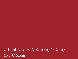 CIELab 35.268,50.878,27.018 Color is a normal red color and the nearest color is Mexican Red #a72525. Hex code #9f212b and RGB value is rgb(159,33,43). In RGB color space, this color is composed of 62% red, 13% green, 17% blue, In CMYK color space, this color is composed of 0% cyan, 79% magenta, 73% yellow , 38% black , In HSL color space, this color has a hue angle of 355° , 66% saturation and 38% lightness.