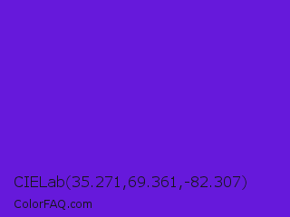 CIELab 35.271,69.361,-82.307 Color is a normal violet color and the nearest color is Purple Heart Crayola #652dc1. Hex code #6619db and RGB value is rgb(102,25,219). In RGB color space, this color is composed of 40% red, 10% green, 86% blue, In CMYK color space, this color is composed of 53% cyan, 89% magenta, 0% yellow , 14% black , In HSL color space, this color has a hue angle of 264° , 80% saturation and 48% lightness.