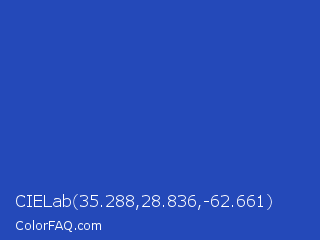 CIELab 35.288,28.836,-62.661 Color is a normal blue color and the nearest color is Denim Blue #2243b6. Hex code #2449b9 and RGB value is rgb(36,73,185). In RGB color space, this color is composed of 14% red, 29% green, 73% blue, In CMYK color space, this color is composed of 81% cyan, 61% magenta, 0% yellow , 27% black , In HSL color space, this color has a hue angle of 225° , 67% saturation and 43% lightness.