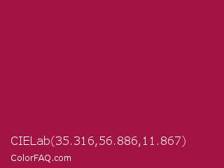 CIELab 35.316,56.886,11.867 Color is a normal rose color and the nearest color is French Wine #ac1e44. Hex code #a31343 and RGB value is rgb(163,19,67). In RGB color space, this color is composed of 64% red, 7% green, 26% blue, In CMYK color space, this color is composed of 0% cyan, 88% magenta, 59% yellow , 36% black , In HSL color space, this color has a hue angle of 340° , 79% saturation and 36% lightness.