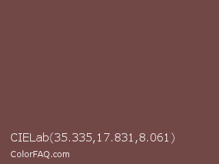 CIELab 35.335,17.831,8.061 Color is a normal red color and the nearest color is Roast Coffee #704241. Hex code #724847 and RGB value is rgb(114,72,71). In RGB color space, this color is composed of 45% red, 28% green, 28% blue, In CMYK color space, this color is composed of 0% cyan, 37% magenta, 38% yellow , 55% black , In HSL color space, this color has a hue angle of 1° , 23% saturation and 36% lightness.