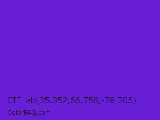 CIELab 35.352,66.758,-78.705 Color is a normal violet color and the nearest color is Purple Heart Crayola #652dc1. Hex code #681ed5 and RGB value is rgb(104,30,213). In RGB color space, this color is composed of 41% red, 12% green, 84% blue, In CMYK color space, this color is composed of 51% cyan, 86% magenta, 0% yellow , 16% black , In HSL color space, this color has a hue angle of 264° , 75% saturation and 48% lightness.