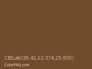 CIELab 35.42,12.374,25.935 Color is a dark orange color and the nearest color is Dallas #6e4b26. Hex code #714b2a and RGB value is rgb(113,75,42). In RGB color space, this color is composed of 44% red, 29% green, 16% blue, In CMYK color space, this color is composed of 0% cyan, 34% magenta, 63% yellow , 56% black , In HSL color space, this color has a hue angle of 28° , 46% saturation and 30% lightness.