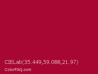 CIELab 35.449,59.088,21.97 Color is a normal rose color and the nearest color is Shiraz #b20931. Hex code #a80734 and RGB value is rgb(168,7,52). In RGB color space, this color is composed of 66% red, 3% green, 20% blue, In CMYK color space, this color is composed of 0% cyan, 96% magenta, 69% yellow , 34% black , In HSL color space, this color has a hue angle of 343° , 92% saturation and 34% lightness.