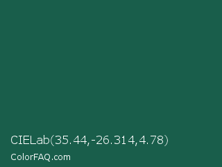CIELab 35.44,-26.314,4.78 Color is a dark green color and the nearest color is Green Pea #1d6142. Hex code #195e4b and RGB value is rgb(25,94,75). In RGB color space, this color is composed of 10% red, 37% green, 29% blue, In CMYK color space, this color is composed of 73% cyan, 0% magenta, 20% yellow , 63% black , In HSL color space, this color has a hue angle of 163° , 58% saturation and 23% lightness.
