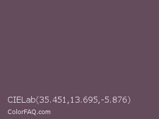 CIELab 35.451,13.695,-5.876 Color is a normal magenta color and the nearest color is Zambezi #685558. Hex code #654c5d and RGB value is rgb(101,76,93). In RGB color space, this color is composed of 40% red, 30% green, 36% blue, In CMYK color space, this color is composed of 0% cyan, 25% magenta, 8% yellow , 60% black , In HSL color space, this color has a hue angle of 319° , 14% saturation and 35% lightness.