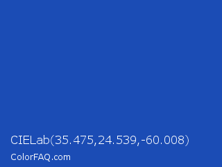 CIELab 35.475,24.539,-60.008 Color is a normal blue color and the nearest color is Denim Blue #2243b6. Hex code #1b4cb5 and RGB value is rgb(27,76,181). In RGB color space, this color is composed of 11% red, 30% green, 71% blue, In CMYK color space, this color is composed of 85% cyan, 58% magenta, 0% yellow , 29% black , In HSL color space, this color has a hue angle of 221° , 74% saturation and 41% lightness.